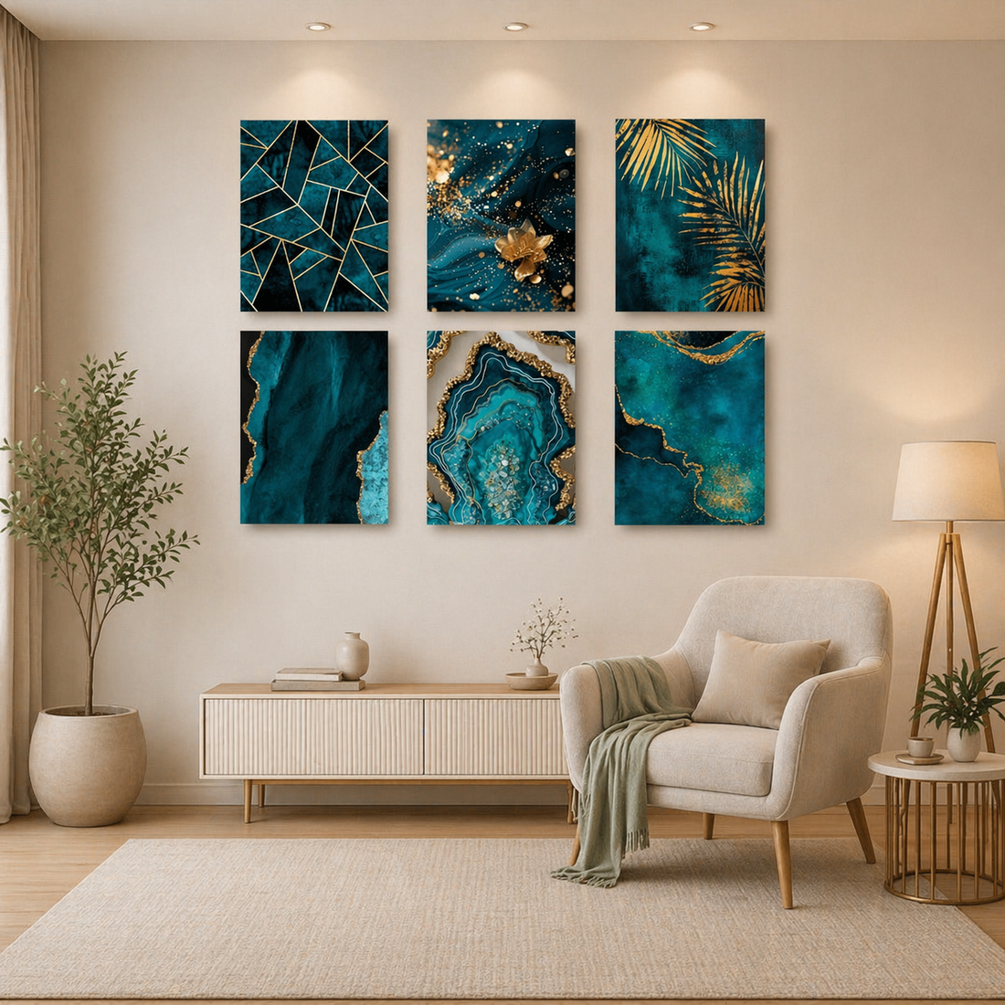 ✨ Teal & Gold Theme – Set of 6 Wall Art Premium Wooden Home Decor...